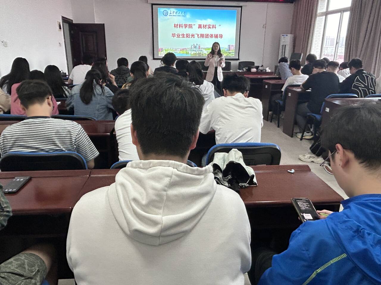 为精准赋能2025届毕业生成长发展,近日材料学院分别于云塘校区新能源一栋908会议室和工科三号楼A201会议室分场次举办研本毕业生“阳光飞翔”发展赋能团体辅导,学院党委副书记邵巧艳、辅导员谢易真、王志亮与全体毕业生共话成长,通过“定制化辅导+精准化帮扶”双轮驱动,为毕业生成长发展注入强心剂。