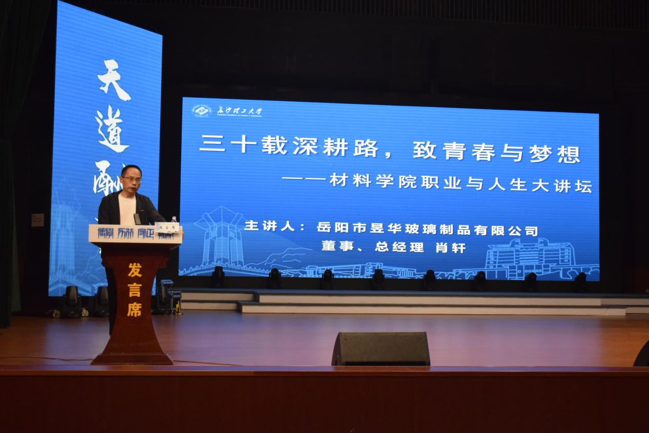 世界杯官网89届硅酸盐专业杰出校友,岳阳市昱华玻璃制品有限公司董事、总经理、高级工程师肖轩出席并作《三十载耕路 致青春与梦想》专题报告。