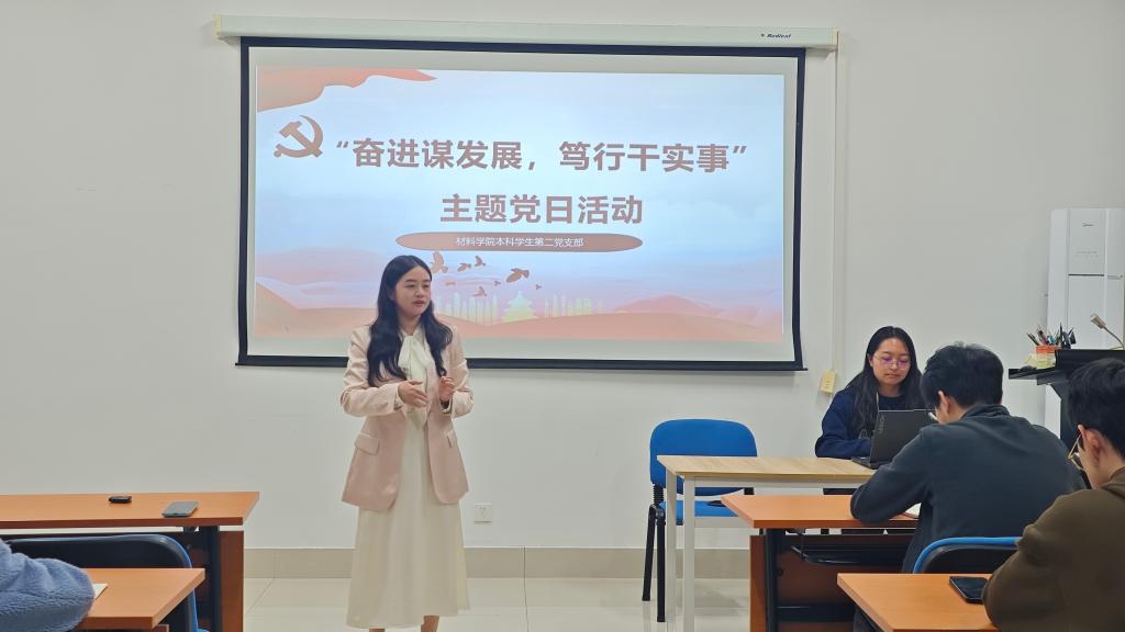 10月21日晚19:00,材料科学与工程学院本科学生第二党支部在新能源1号楼804室举办“奋进谋发展,笃行干实事”主题党日活动,活动由党员邓沁怡主持。
