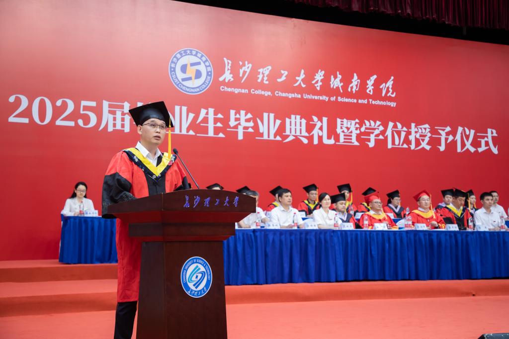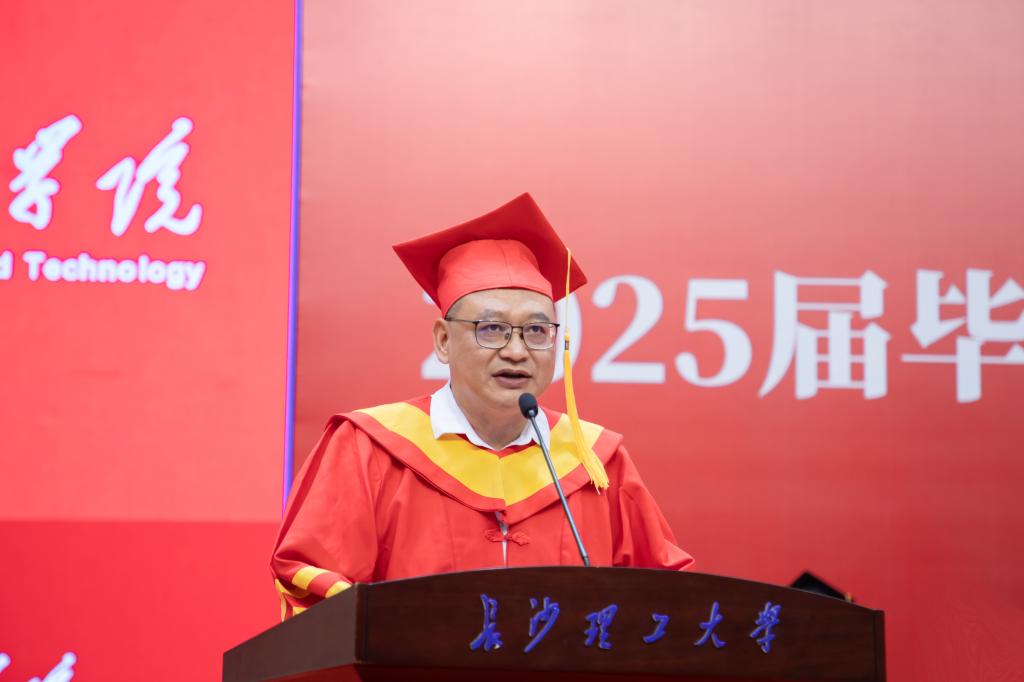 刘朝晖代表学校向全体2025届毕业生表示热烈的祝贺,向悉心教导同学们的老师和默默支持的父母致以最崇高的敬意。他希望同学们逐光而行,用奋斗和坚持让梦想绽放光芒,书写人生壮丽的篇章!他期望同学们志存高远,勇担使命;终身学习,踔厉奋发;自立自信,坚定前行;勇于创新,敢于突破。