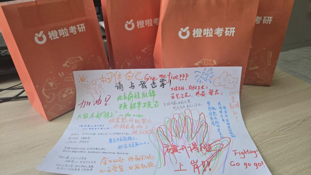 随后,施一满和系部辅导员一起为每位备考学子送上精心准备的“考研暖心礼包”。这份满载着系部深切关怀与殷切期望的礼物,让在寒冬中奋力拼搏的考研人真切感受到家一般的温暖与力量。为进一步提振备考学子的积极性,缓解紧张的备考氛围,现场还特别设置了“请和我击掌”互动环节。同学们纷纷在专属展板上印下自己的手印,饱含热忱地写下对自己、对同窗的真挚祝福,一笔一画都凝聚着初心与期许。展板在学子们手中依次传递,仿佛能听到接力击掌的清脆声响回荡在自习室,驱散了备考的疲惫,凝聚起奋进的底气,每一份赤诚祝愿都化作勇往直前的动力,让寒冬里的备考之路满是温暖与光亮。