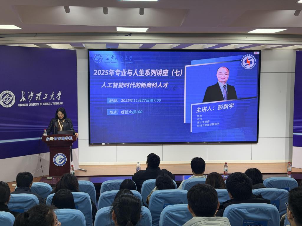 11月27日,城南学院2025年“专业与人生”系列讲座(七)在在线买世界杯平台12号教学楼报告厅顺利举行。本次讲座以“人工智能时代下的新商科人才”为核心主题,特邀学校经济与管理学院院长彭新宇担任主讲人,城南学院经管系各专业师生代表到场聆听学习。