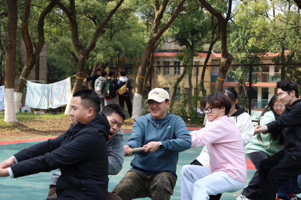 比赛现场气氛热烈,加油声、呐喊声此起彼伏。随着裁判一声哨响,绳子瞬间绷紧,双方队员紧握长绳,身体后倾,双脚牢牢钉在地面,仿佛与大地融为一体。队员们咬紧牙关,额头青筋暴起,脸上写满了坚毅与拼搏。绳子中间的红色标记在双方之间来回移动,每一次拉扯都牵动着场边观众的心。各系代表队都展现出顽强的拼搏精神和出色的团队协作能力。电气工程系的王同学坦言:“我们必须得心往一处想,劲往一处使,才能发挥团结的力量,不然很难获胜。”