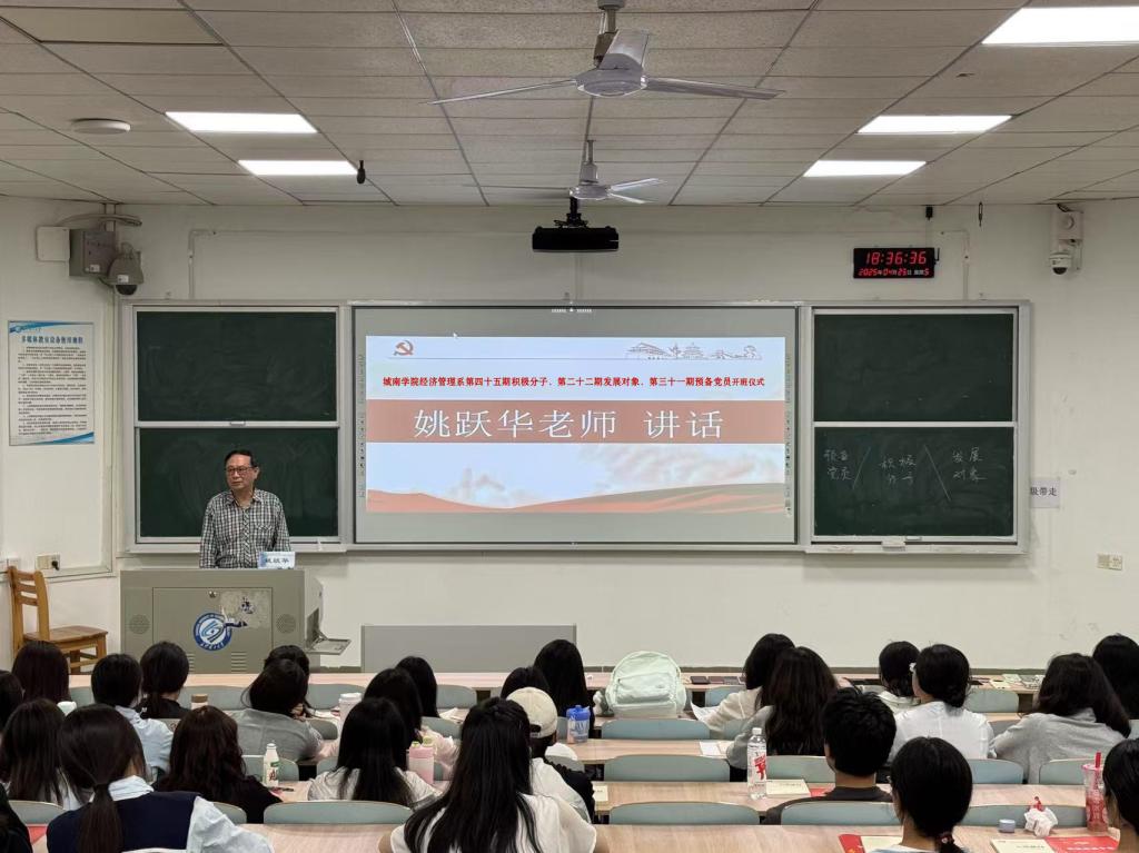 4月25日,城南学院经济管理系第四十五期积极分子、第二十二期发展对象、第三十一期预备党员培训班开班仪式在6教108教室举行。城南学院关工委常务副主任姚跃华老师受邀出席,经济管理系年级辅导员赵泽铭老师主持,全体参训学员以饱满的精神状态参与此次开班仪式。