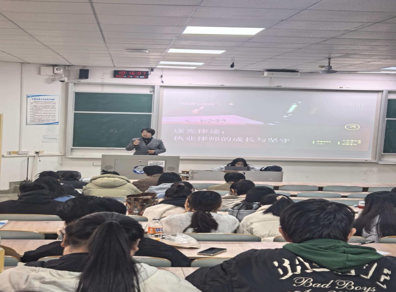 2025年12月19日上午,《法律职业伦理》课堂迎来行业导师北京德和衡(长沙)律师事务所高级合伙人奉慧娟律师,专创融合示范课正式开讲,也为法学院“专创融合”课程改革按下启动键。奉慧娟律师以“逐光律途:职业律师的成长与坚守”为主题,为二百余名大四本科生带来一场有温度、有深度的双创盛宴。