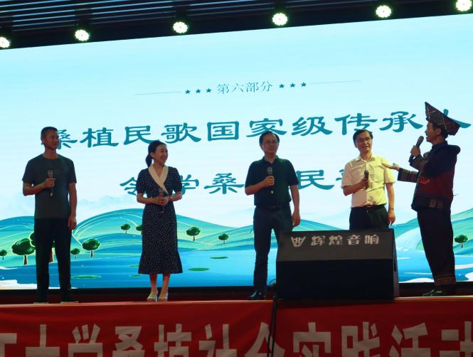 为了吸引广大群众前来观看,老师们还前往当地艺术团邀请桑植民歌国家级传承人尚生武老师。演出现场,座无虚席,当地百姓自发前往。当地艺术家们的《花灯喜赞党的二十大》《桑植是个好地方》等节目与同学们的反拐普法剧、禁赌宣传剧以及《仰望星空》《如愿》《有我》等合唱相得益彰,四个实践调研组的汇报也穿插其中,现场气氛十分活跃。在全场大合唱《灯火里的中国》中,汇报演出结束。