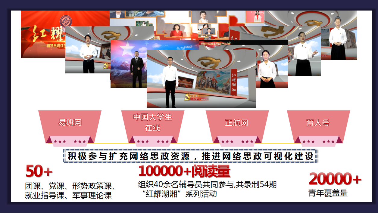 扎根时代沃土,讲好时代故事,培育时代新人是他做网络思政的出发点与落脚点。他积极参与学校学习贯彻党的二十大精神微宣讲团建设,为学校全体辅导员、各学院学生开展微宣讲十余次,开展辅导员话信仰直播十余期,在国家安全日等特殊节点开设线上直播课程。相关视频入选2022年全国高校教师国家安全教育教学视频征集与展示活动网络展示环节。他还坚持贯通线上线下各环节,将系列网络文章与所带学生的成长阶段相结合,本学期以来相继撰写《给2023年的你们,也给十年前的自己》《分享书单,谈谈阅读》《如果你要写军训,就不能只写军训》《再见,综测》《“i人”“e人”?不要“IE”,我选择“百度”或者“360”》。文为时而著,术为生而谋,近年来,依托网络育人工作实践,他在《湖南日报》(理论版)等发表论文8篇,主持省教育厅科研课题等省级项目3个,获湖南省第一届辅导员综合育人能力提升示范观摩活动一等奖等省级奖项6个。在躬身网络育人实践中,提升了自身的育人能力。