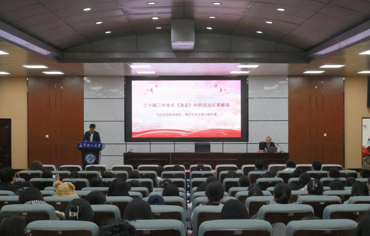 11月27日晚上,长沙市法学会办公室主任、秘书长黄俊峰博士受邀来我院作“党的二十届三中全会《决定》中的法治元素解读”专题讲座。院党委副书记汪伦主持,法学院本科生、研究生党支部全体党员参加。