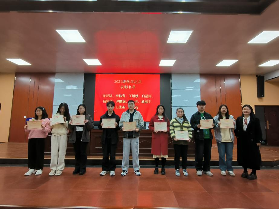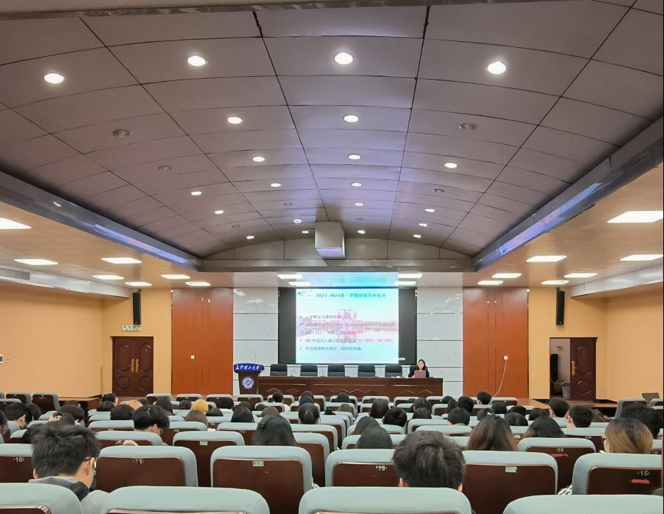 首先,曾宇欣从年级总体成绩情况、专业课程和四六级通过率等方面切入,深入开展学情分析,并对上一学期的学业标兵和进步典型作表扬。