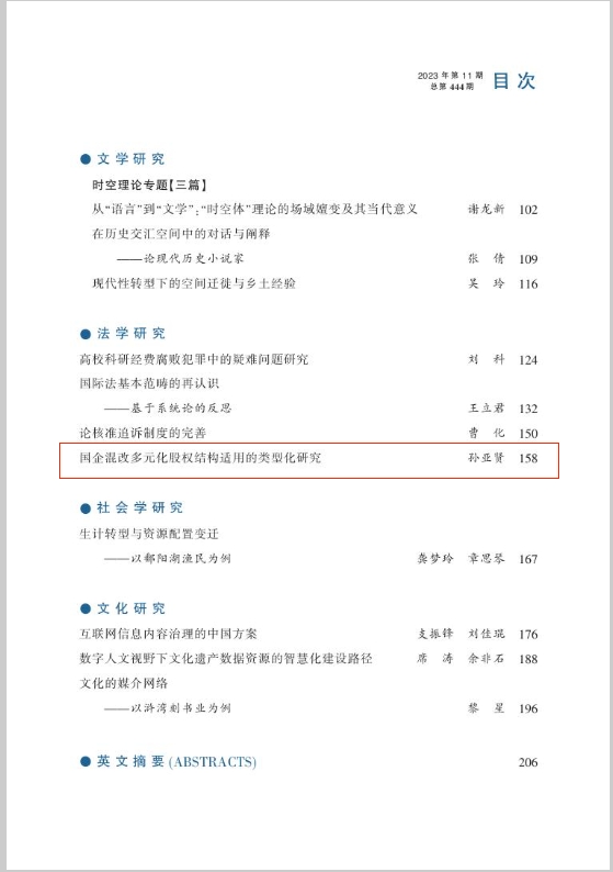 近日,在线买世界杯平台法学院讲师孙亚贤在《江西社会科学》(CSSCI来源期刊)2023年第11期发表论文《国企混改多元化股权结构适用的类型化研究》。