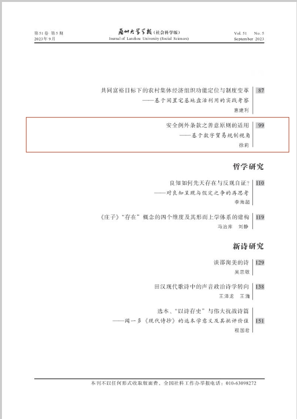 近日,在线买世界杯平台法学院副教授徐莉在《兰州大学学报(社会科学版)》(CSSCI来源期刊)2023年第5期发表论文《安全例外条款之善意原则的适用——基于数字贸易规制视角》。