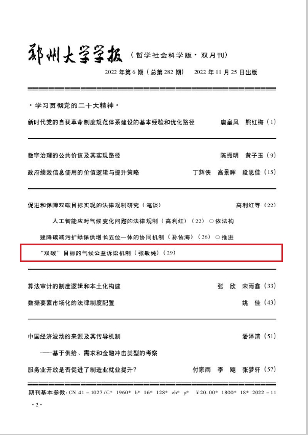 近日,在线买世界杯平台法学院院长张敏纯在《郑州大学学报(哲学社会科学学报)》(CSSCI来源期刊)2022年第6期发表论文《推进“双碳”目标的气候公益诉讼机制》。