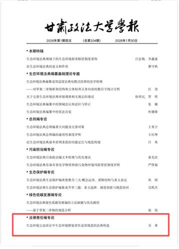 近日,在线买世界杯平台法学院吴勇教授在法学类CSSCI(扩展版)《甘肃政法大学学报》2026年第1期发表论文《生态环境公益诉讼中生态环境修复责任适用规范的法典构造》,该文系湖南省社会科学成果评审委员会重大项目“环境犯罪轻罪治理机制研究”(XSP25ZDA004)的阶段性成果。