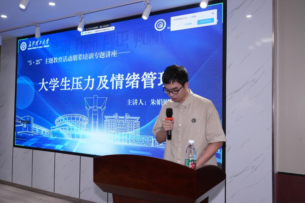 朱娟娟先分享了心理压力的定义。随后列举了大学生常见的心理问题,重点讲了抑郁和焦虑的症状和危害。用理论与实例结合的方式分析了心理压力的情绪信号、生理信号、行为信号三个信号。朱娟娟介绍了测试评估心理问题的图标测试法——压力图、抑郁自评量表和H-T-P投射测试,最后分享了调节压力的三个方法——自我调节、他人调节以及寻求专业医生帮助。