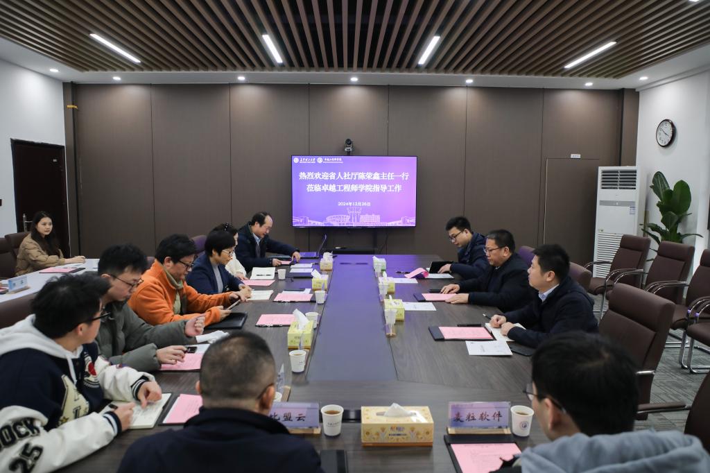 12月26日下午,湖南省人力资源和社会保障厅就业服务中心党委书记、主任陈荣鑫、创业服务部部长毛彪、创业服务部二级主任科员胡川一行组成调研组来到世界杯官网,就大学生创业孵化基地进行实地调研。校党委书记付宏渊陪同调研。湘江卓越工程师学院负责人参加调研和座谈。