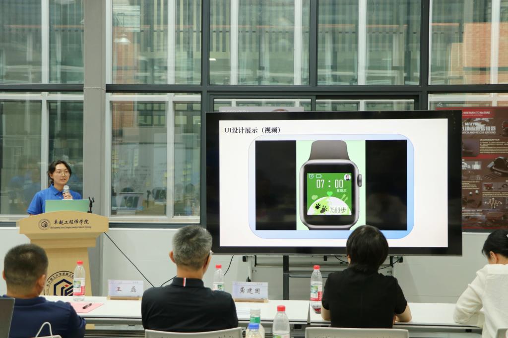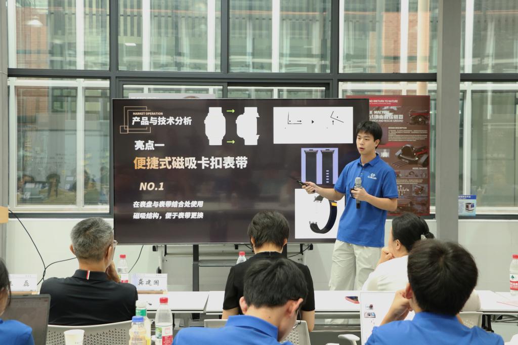 闭幕式上,5支项目团队依次登台,进行了精彩的项目展示与答辩,他们聚焦智能穿戴设备领域的前沿需求与应用场景,展示了从需求洞察、方案设计到技术实现的全流程实践成果,项目分别覆盖健康监测、运动辅助、学习辅助、人机交互等多个智能化方向“这款智能手环的续航方案是否考虑过与其他电子产品的互连?”“这款手表精准定位的目标群体是大学生还是中小学生?”随着评委的提问,学员迅速调出模型和调研数据进行答辩,充分展现了青年学子的创新思维与技术攻坚能力,现场反响热烈。