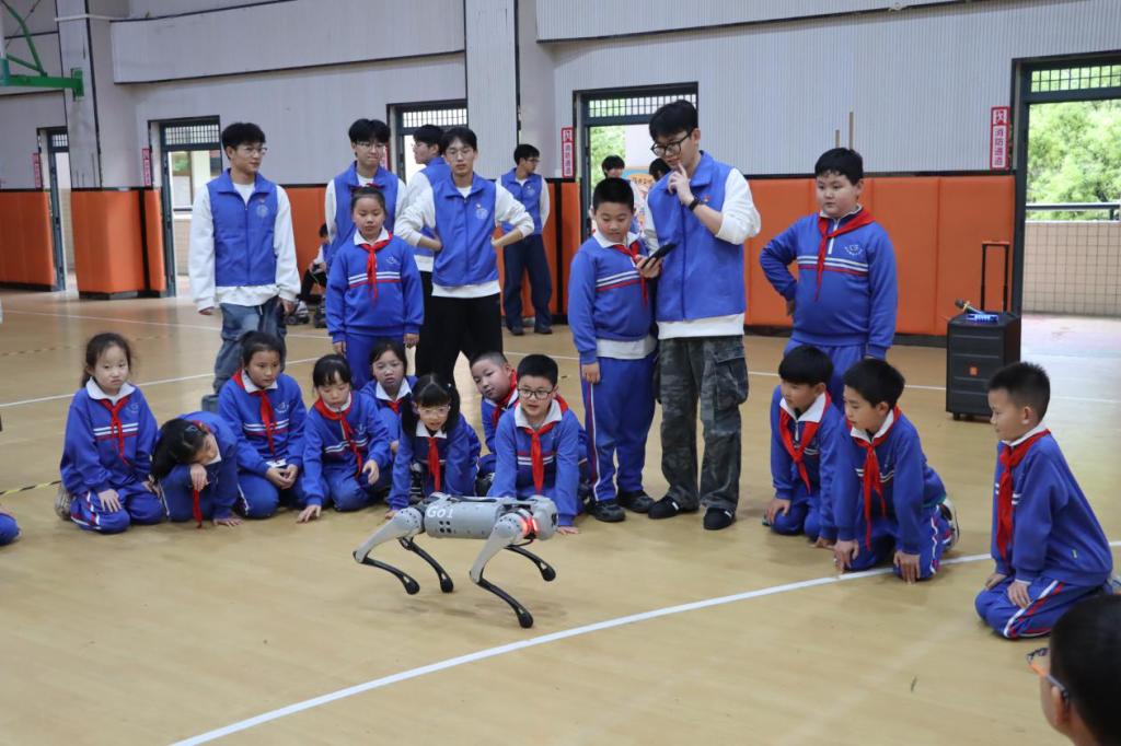 在体育馆内,大学生志愿者指导小朋友们亲手操作了ep步兵机器人,并近距离感受宇树科技第一代机器狗的先进技术。孩子们时而专注操控,时而欢呼雀跃,科技的魅力在他们眼中熠熠生辉。