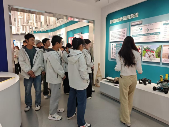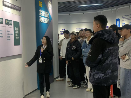 在创新创业教育展厅,讲解员为前来参观的同学们详细介绍了学校为创业学生提供的各项扶持政策,包括创业指导、基地入驻、水电租金减免、创业基金支持等内容,帮助同学们更全面地了解创业资源与机会。