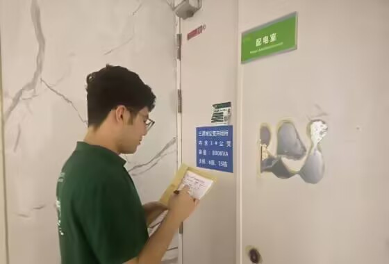 与此同时,在配电室门口,实践队员都浩然手持低压“三零”服务现场工作交接单,严格按照规范流程进行细致勘察。他一丝不苟地核验台区名称,精准定位接入点位置,并依据现场线路布局和设备实况,科学确定所需材料型号、规格及数量。得益于前三周的实践积累,他对现场勘察关键点的把握更为精准到位,每一项判断都力求兼顾规范要求与实际效能,通过扎实的前期准备,为保障群众用电需求打下坚实基础,切实推动“三零”服务的便民政策落到实处。