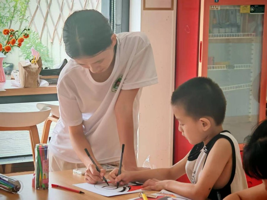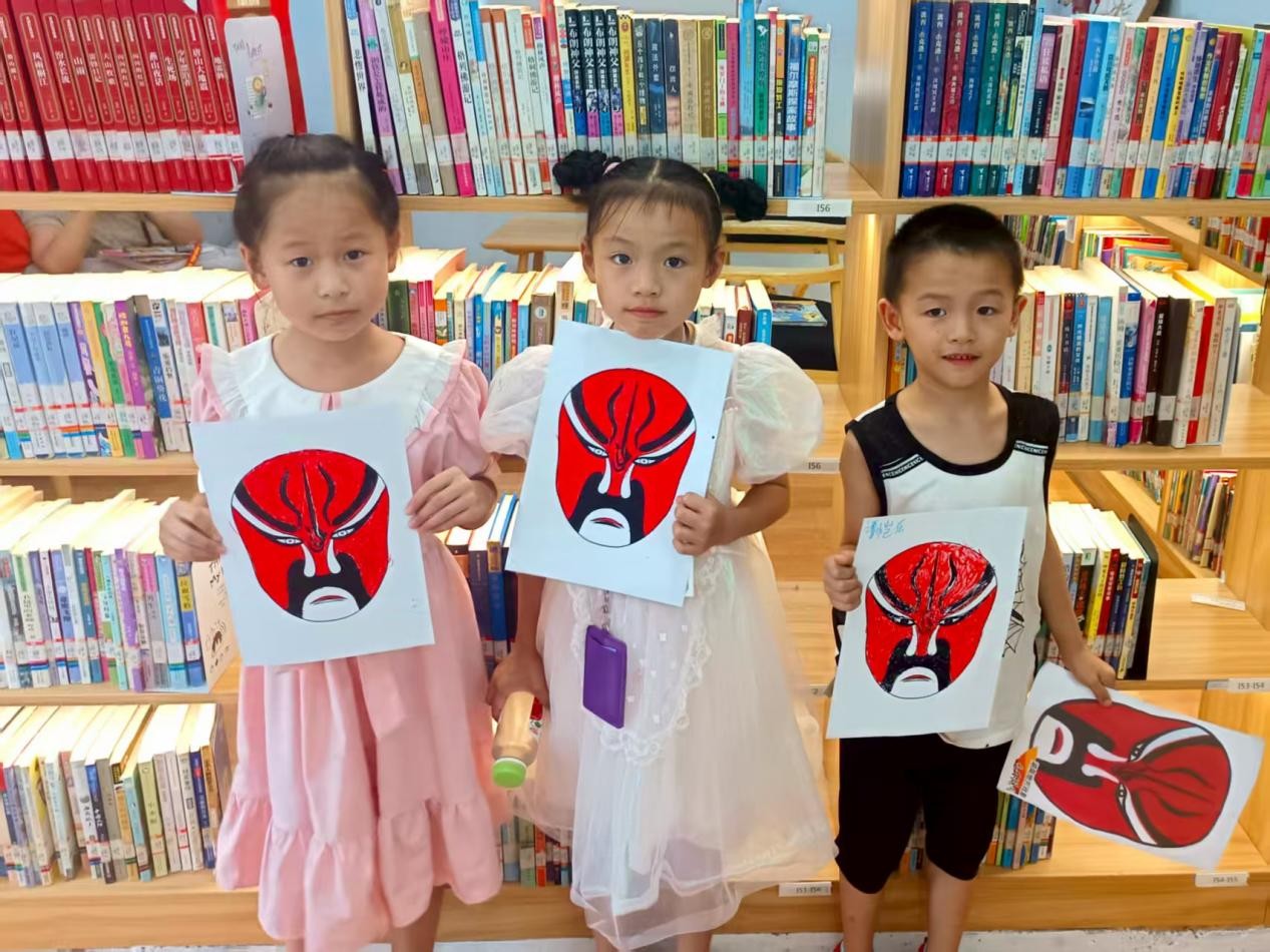 随后的手工课堂上,志愿者带来一场别开生面的湘剧文化启蒙课。他们详细介绍湘剧“高弹昆乱”的声腔特点,并讲述剧中经典故事,引来孩子们阵阵提问。“面具颜色代表什么?”——通过志愿者的讲解,孩子们理解了“红色代表忠义、白色象征奸诈”等传统戏曲符号的含义。在面具绘制环节,孩子们认真下笔,有的复刻传统纹样,有的自由发挥创意,使湘剧艺术与童真趣味巧妙交融。这一过程不仅锻炼了他们的动手能力,更在他们心中埋下了文化认同的种子。