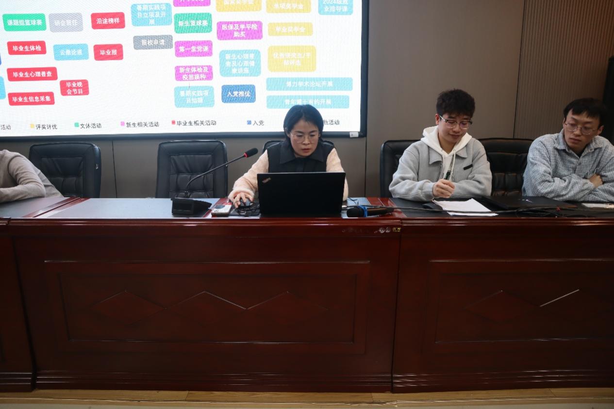 会议伊始,樊喜雁介绍学院研究生基本情况,为与会人员提供了清晰的背景信息,并梳理了全学年的重点工作与关键注意事项。随后团委副书记李艾霖强调纪律问题,明确阐述了研究生会成员必须遵守的一系列纪律规定,还简要介绍了优秀研会评比的各类规则与注意事项,通过明确的评选标准和公平公正的评比流程推动研会各项工作的高效开展。执行主席刘丁玮提出活动参与积极性问题。为了增强研会成员的活动参与的积极性,会议讨论了如何激发大家的积极性,包括设立奖励与惩罚机制等。鼓励研会成员积极参与各种活动的策划、投身于各种活动中。最后,各部门部长对近段时间部门工作进行了汇报,包括工作成果、存在的问题以及未来的规划等多个方面。