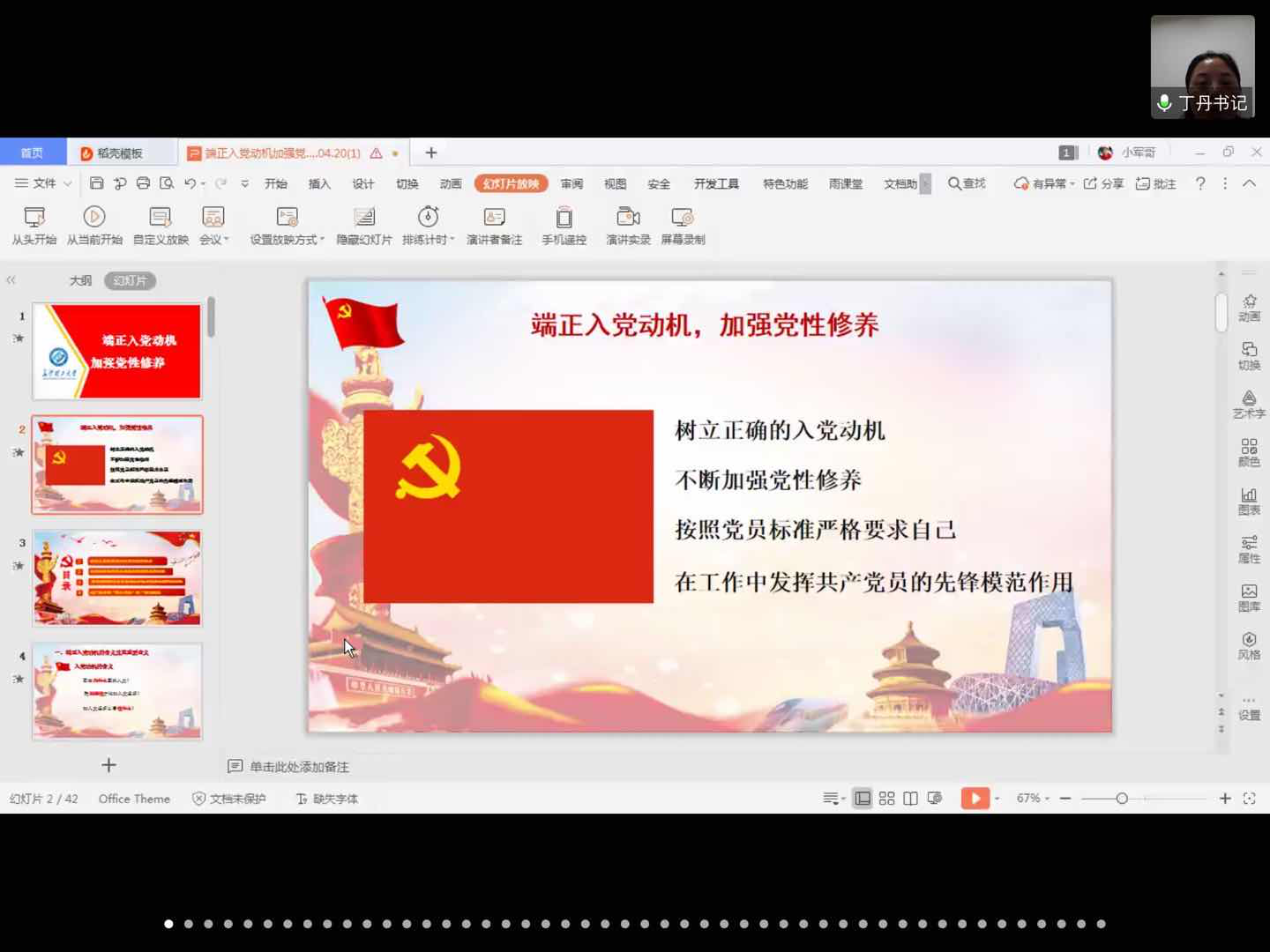 《端正入党动机、加强党性修养》专题由土木学院党委副书记(主持工作)丁丹讲授。丁丹对入党动机和党性修养的含义及意义进行了详细介绍,强调学生党员发展对象要树立信仰型入党动机、坚定正确的政治导向、坚持崇高的理想信念。丁丹指出学生党员发展对象要从强思想、提能力、践行动三个方面加强自身党性修养,并激励学生党员发展对象勇做新时代的奋进者和拼搏者。