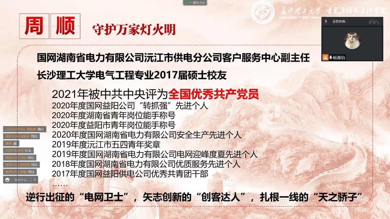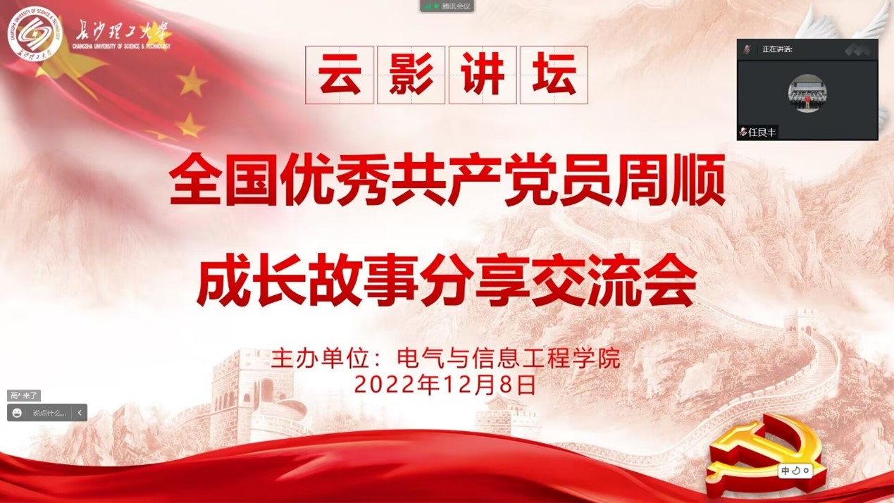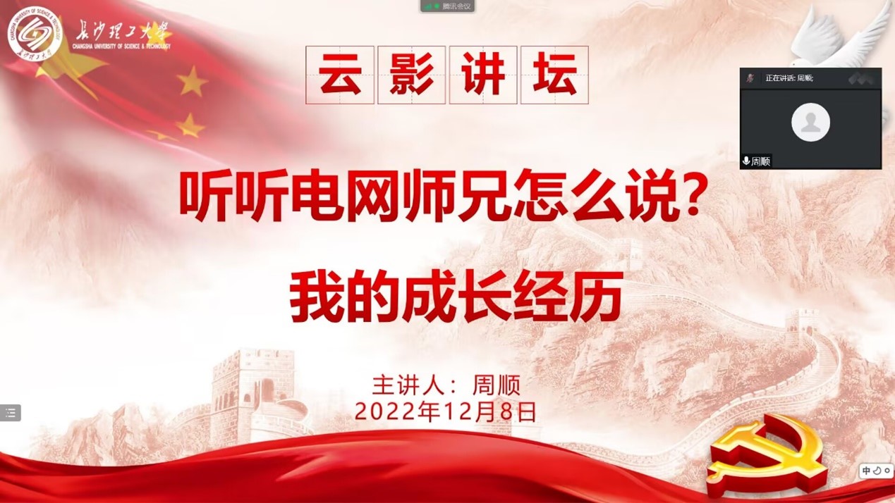 12月8日上午,电气学院开展云影讲坛系列专题讲座,邀请全国优秀共产党员、世界杯官网2017届优秀硕士校友周顺主讲,电气学院党委副书记任艮丰、研究生辅导员杨湘怡出席,全体2022级硕博研究生参加。