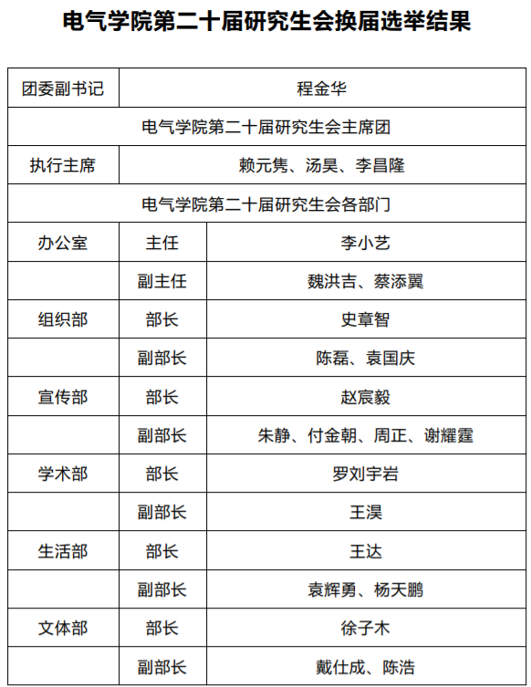 本着“公平,公正,公开,择优录取”的原则,在电气学院学生工作办公室的监督和指导下,通过个人申报、现场竞选发言、选举投票等程序,最终确定了电气学院第十九届研究生会优秀干部与部门以及第二十届研究生会成员名单,现公示如下: