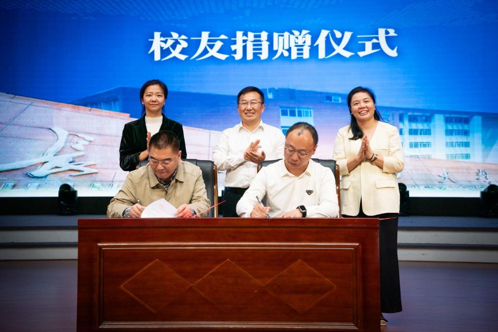 在张军辉、唐青、丁丹及现场近1000人的见证下,郑智勇与肖晖签订了捐赠协议,向学校教育基金会捐赠100万元。