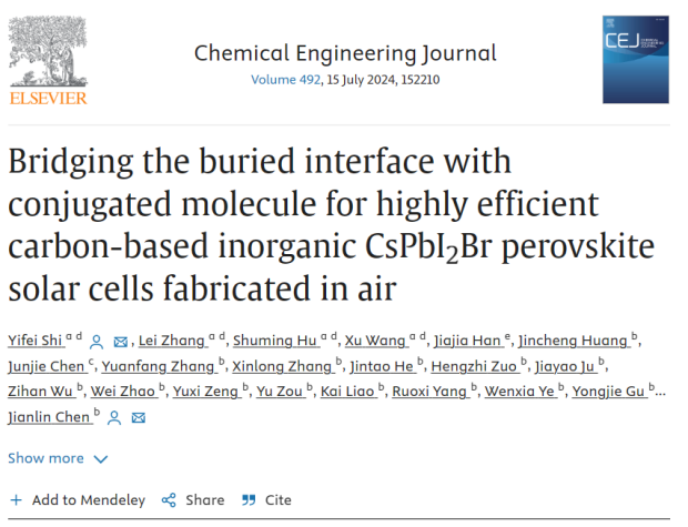 本研究成果以“Bridging the buried interface with conjugated molecule for highly efficient carbon-based inorganic CsPbI2Br perovskite solar cells fabricated in air”为题撰写的论文,已在国际顶级期刊《Chemical Engineering Journal》(影响因子IF=15.1,中科院一区TOP期刊)发表。电气学院教师时一斐为第一作者,硕士研究生张雷为学生第一作者,电网防灾减灾全国重点实验室(在线买世界杯平台)为第一完成单位。这项工作推动了空气中制备全无机钙钛矿电池的研究,拓展了共轭材料的应用,深入探究了界面工程中共轭材料的影响效果和作用机理,为其他类型钙钛矿太阳能电池以及发光二极管、光电探测器、场效应晶体管等器件的研发提供了新思路。