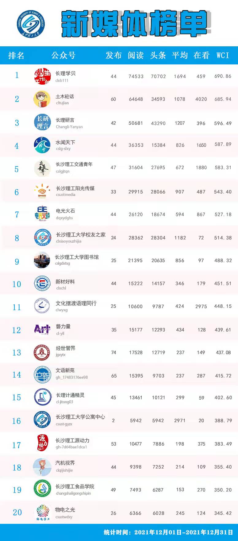 2021年12月长理校园新媒体榜单TOP20