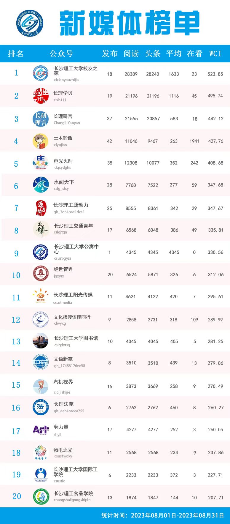 校属单位微信公众号排名(2023年8月)
