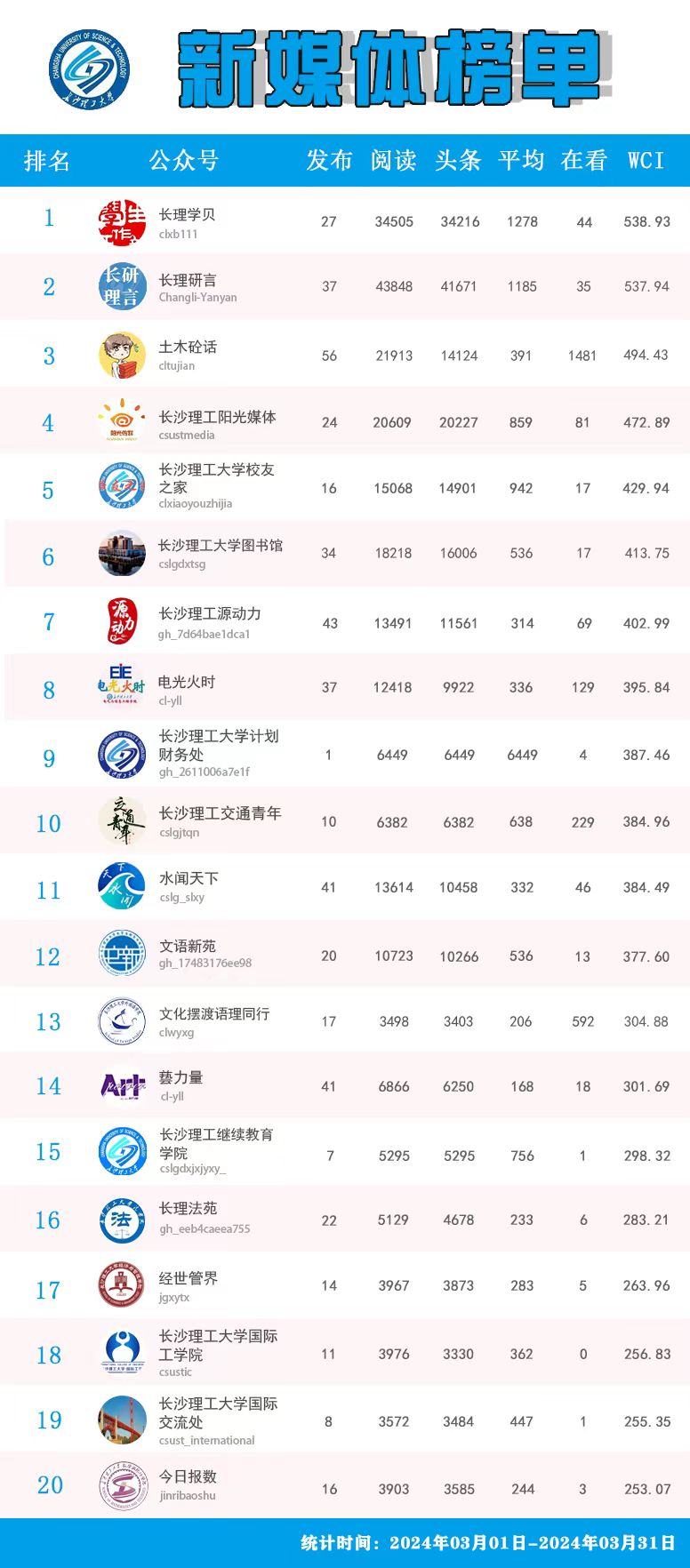 校属单位微信公众号排名(2024年3月)