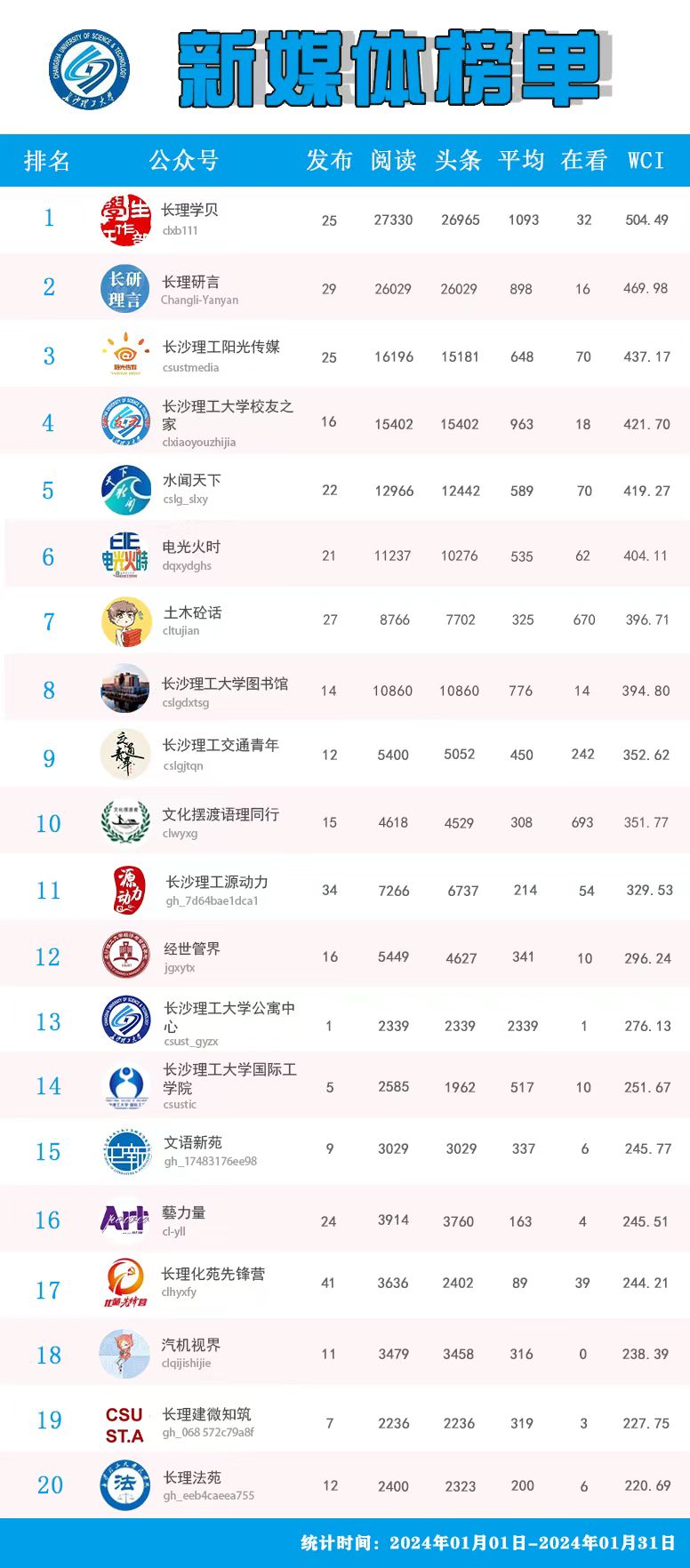 校属单位微信公众号排名(2024年1月)