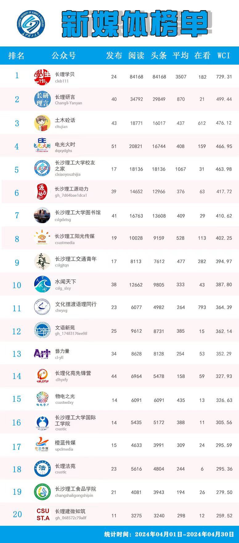 校属单位微信公众号排名(2024年4月)