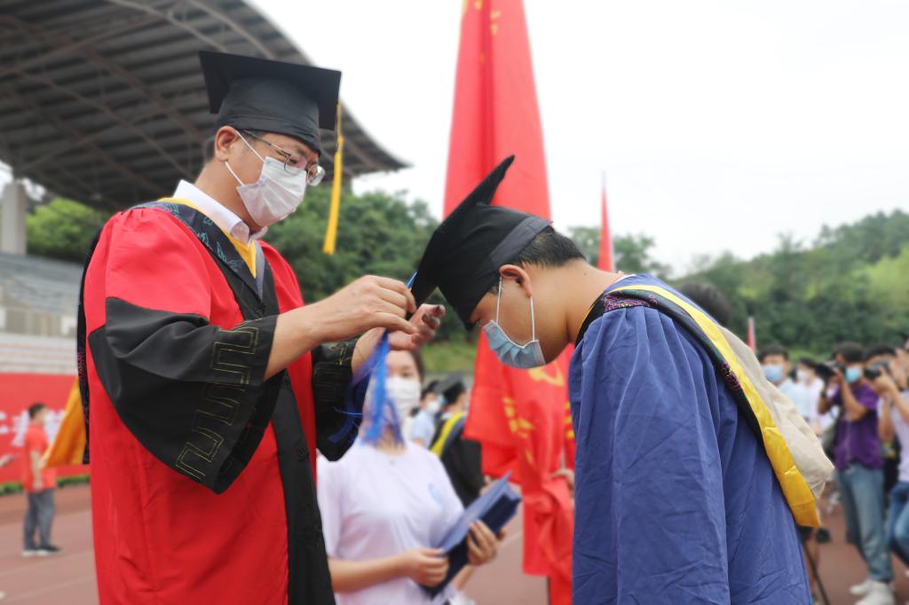 毕业典礼后,校领导和导师代表为毕业生一一拨穗正冠并颁发学位证书。