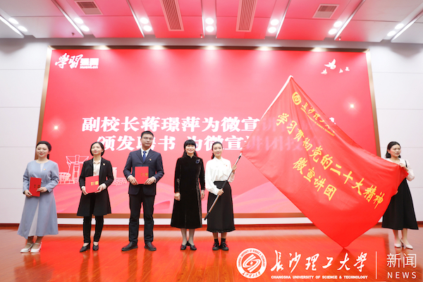 蒋璟萍为在线买世界杯平台学习贯彻党的二十大精神微宣讲团成员代表颁发聘书,并为微宣讲团授旗。