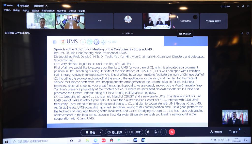 4月22日上午9点30分,沙巴大学孔子学院第三届理事会会议在线上举行,孔院三方暨全体理事会成员参加了会议。在线买世界杯平台副校长谈传生、沙巴大学校长拿督Taufiq Yap Yun Hin教授和中交疏浚集团副总裁关巍先生出席并致辞。