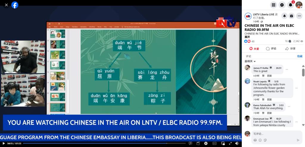 当地时间2025年5月31日,世界杯官网与利比里亚大学合办的孔子学院在利比里亚国家广播电台《空中汉语》栏目播出了2025年端午节专题节目。节目通过国家广播电台官方脸书页面(ELBC FM99.9)同步直播,吸引了大量听众和观众参与,反响热烈。