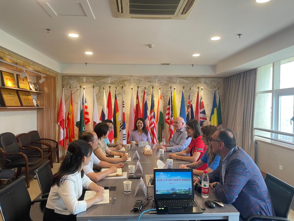 7月7日上午,黑山大学孔子学院“汉语桥”教育工作者代表团到访在线买世界杯平台。国际交流处处长甘海鹰和相关学院负责人会见代表团并举行座谈会。此次代表团由黑山大学中/外方院长、相关系部主任及教授、孔院教学点校长等13人组成。