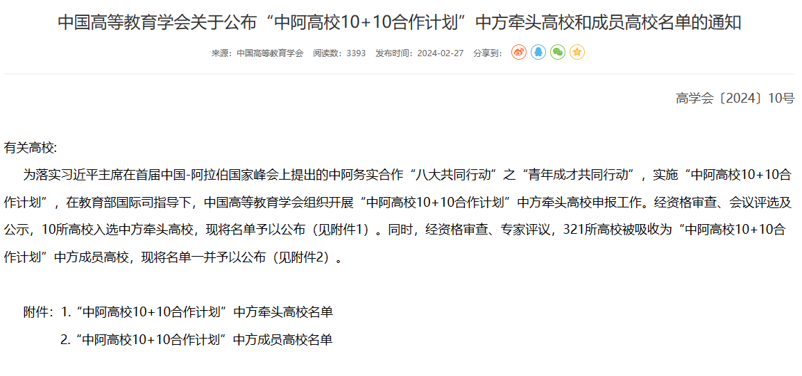 近日,中国高等教育学会公布了“中非大学联盟”交流机制中方成员高校、“中阿高校10+10合作计划”成员高校名单,世界杯官网成功入选。