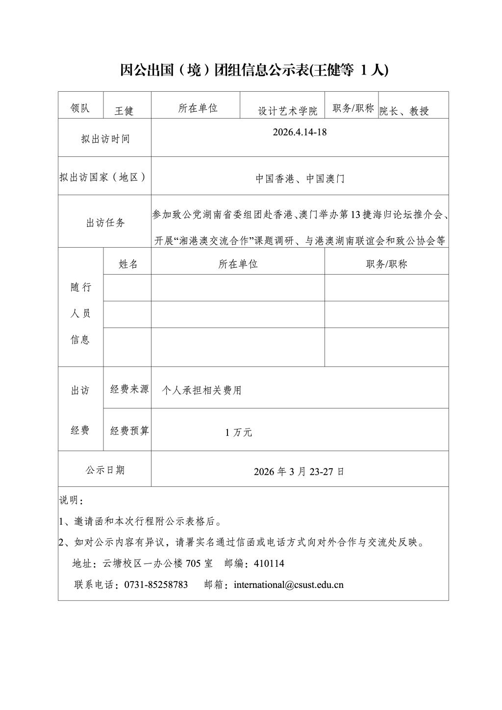 因公出国(境)团组信息公示表(王健等 1人)