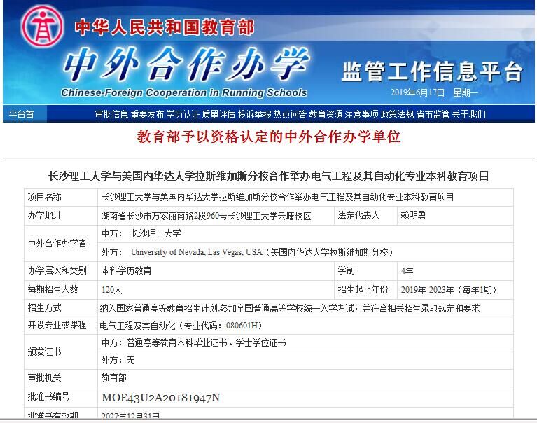 在线买世界杯平台与美国内华达大学拉斯维加斯分校合作举办电气工程及其自动化专业本科教育项目于2018年获得教育部批准(编号:MOE43U2A20181947N),融合两校强势专业“电气工程”之优势,严格遵守《中外合作办学条例》和《中外合作办学条例实施办法》办学,紧密依托国际化、专业化的高水平管理团队运行。该项目融合中美双方优质教育资源,精心打造人才培养方案,其中1/3以上核心课程采用美方原版教材、师资、教学方式等优质教育资源,培养兼具国际化视野与家国情怀、拥有创新精神和跨文化交际能力、系统掌握电气工程专业基础理论知识和现代工程技术、具备良好科学素养与工程实践能力的应用型高级专门人才。