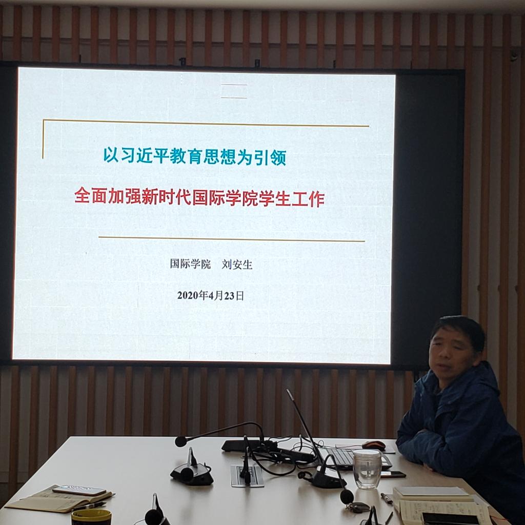 刘安生以“以习近平教育思想为引领,全面加强新时代国际学院学生工作”为题作辅导报告。他在报告中提出新时代学生工作要全面掌握其内涵与任务,要遵循“六个下功夫”的指导思想,要坚持“十个加强”;切实改进和加强学院学生工作要加强学生党建引领、学风建设、构建“五位一体”留学生思想教育体系以及辅导员队伍建设。报告既有理论深度,又有实操性,既是多年来丰富的学生工作经验的传授,也是对学院学生工作的总要求。