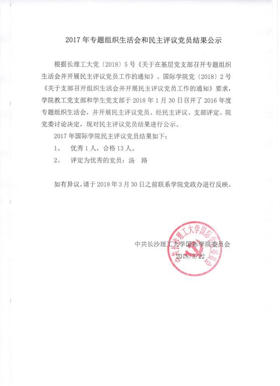 2017年专题组织生活会和民主评议党员结果公示