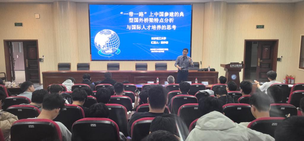 讲座中,田教授列举了“一带一路”沿线国家中我国主导或参与建设的典型桥梁工程,系统展示了各座桥梁的技术特点,阐述了我国企业在建设这些桥梁过程中取得的工程成就,描绘了桥梁建成后对所在国经济政治文化的影响。这些桥梁建设工程不仅凸显了中国桥梁技术的国际领先地位,还展示了“中国方案”在全球基础设施建设中的不可替代性。田教授并根据自己参与国际桥梁建设的深入思考和丰富经验,提出了“一带一路”基础设施建设对国际化工程人才的要求:拥有语言与跨文化沟通能力,掌握全球化工程标准,具备技术创新与数字化能力,了解不同国家的法律与法规,具有可持续发展及环保意识以及国际化视野与思维,鼓励学生们积极发展这些能力。