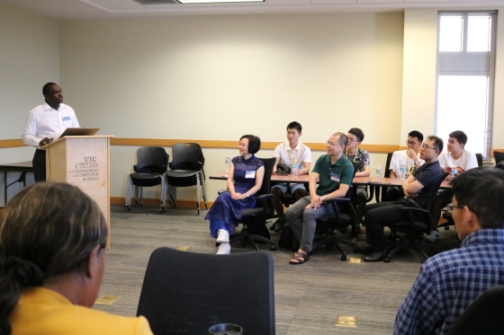 7月29日,世界杯官网赴美夏令营团受到田纳西大学查塔努加分校(UTC)热情欢迎,UTC校方主持了隆重的夏令营开营仪式,UTC工程与计算机科学学院副院长Li Yang、土木环境系系主任Joseph Owino及全系教师、学院学生发展中心负责人Julie David及美方在校学生代表参加。Li Yang副院长代表工程与计算机科学学院对世界杯官网代表团到访表示了热烈欢迎,介绍了学校和学院办学情况,并回顾了两校合作办学工作。陈瑜院长围绕世界杯官网办学情况、国际化教育教学发展、中外合作办学项目的执行及国际化产学研方面做了主题发言。