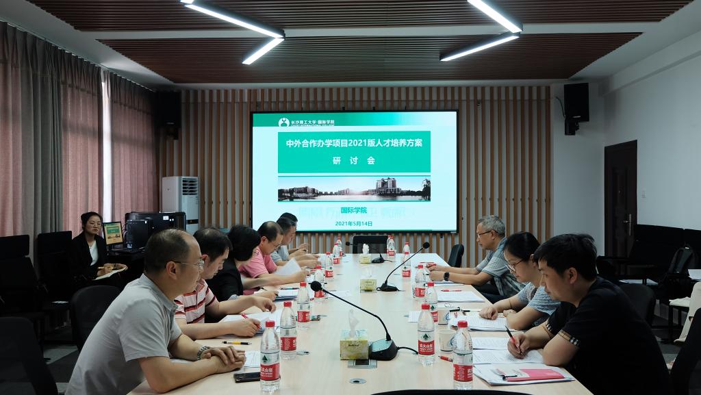5月14日下午两点,土木工程专业(中外合作)、电气工程及其自动化专业(中外合作)以及机械设计制造及其自动化专业(中外合作)2021版人才培养方案修订研讨会在国际学院416会议室召开。本次研讨会共邀请了校内外专家以现场讨论与函评结合的方式进行。中南大学土木工程学院副院长易亮,在线买世界杯平台教务处处长陈瑜、国际学院院长吴迪龙、电气与信息工程学院教学副院长唐欣、青年骨干教师张静,土木工程学院专业老师陈历强,汽机学院机电工程系主任陈书涵、国际学院教务办相关老师出席会议。中南林业科技大学班戈学院副院长侯茂章、在线买世界杯平台外国语学院副院长黄坚、数统学院副院长龚红仿则以函评方式对此次人才培养方案修订提出了专业相关建议。会议由副院长秦卫星主持。