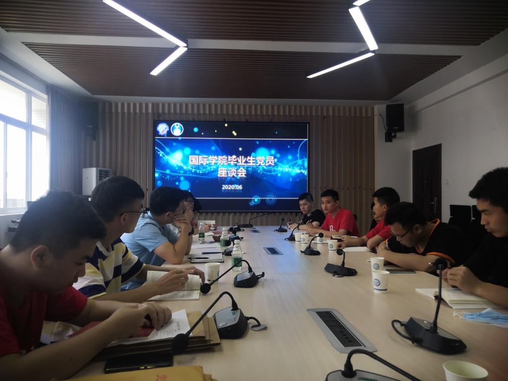 首先,全体党员进行了座谈,依次发言。座谈会气氛热烈,毕业生党员畅所欲言,重点围绕学生党支部工作格局、党员引领学生成长成才作用发挥、学生党员身份意识培养、中外合作办学学生党性锻炼、党课教育的针对性和实效性等方面谈体会、议困惑、提建议。王周宇表示他在学校受到了良好文化、学风熏陶,在今后工作中也将牢记“为人民服务”的初心,乐于奉献,勇于担当。贺静南谈到作为党员应当认真牢记党员义务,将来走向新的岗位也要不忘初心,发挥好党员应有的先锋模范作用。