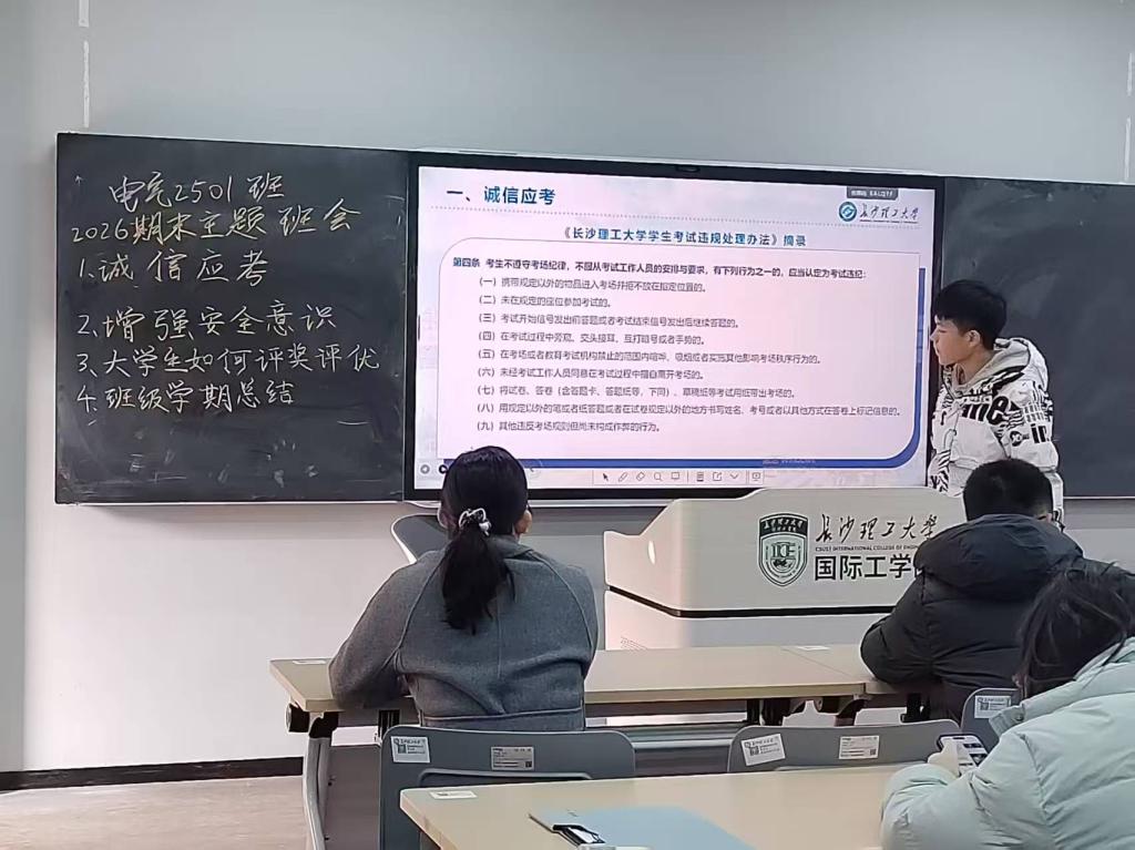 为切实加强学生安全教育与诚信考风建设,强化期末人文关怀与精准帮扶,引导学生平安、有序离校,国际工学院于2026年1月9日至15日以“诚信应考守底线,安全离校暖归家”为主题组织召开了期末主题教育班会,各班班主任、全体学生参与此次会议,班会由班长主持。